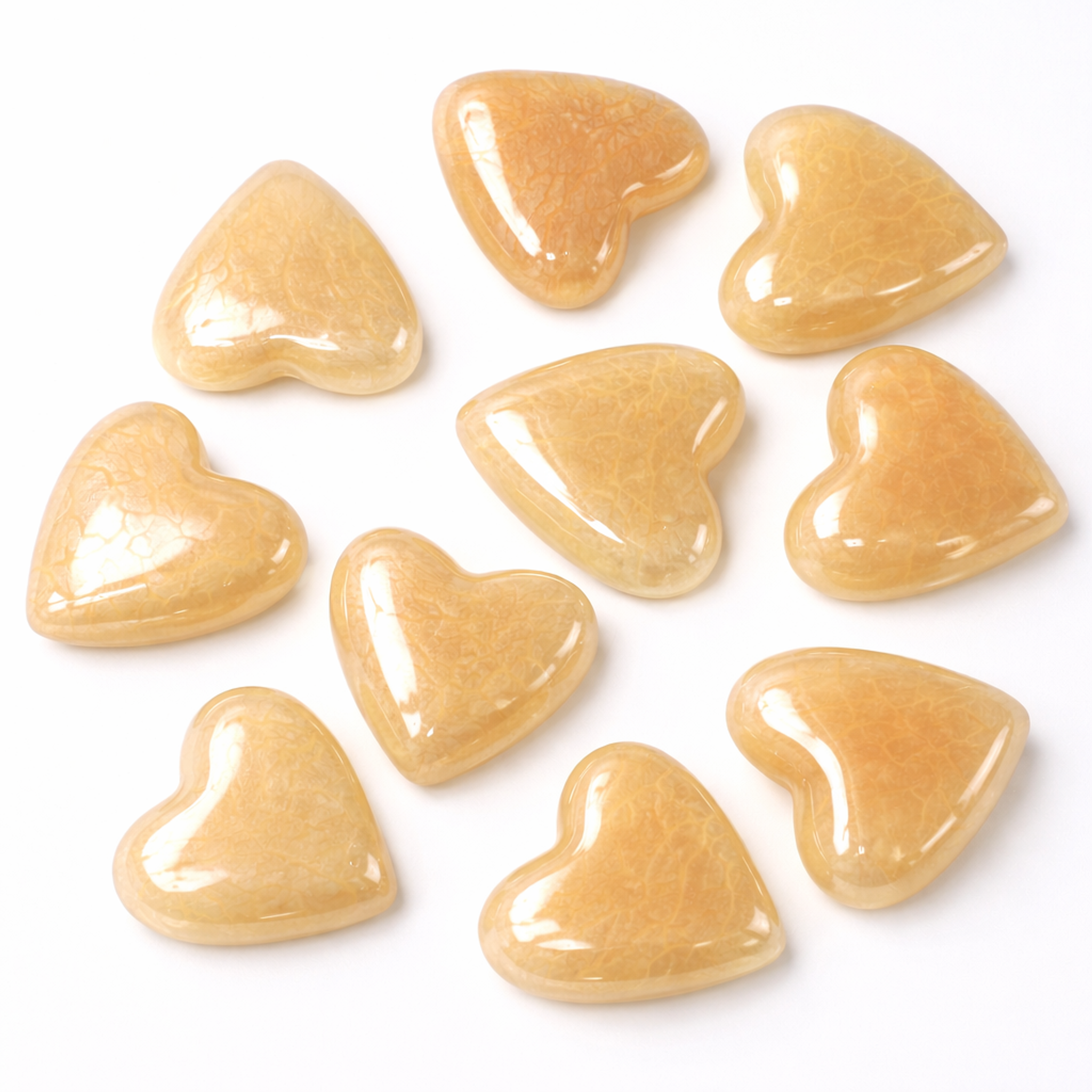 Gefertigt aus transparentem Acryl, besitzen die Herzen einen eingeschlossenen Perlmuttschimmer, der je nach Lichteinfall ein individuelles Muster erzeugt. Dadurch ist jedes Herz optisch ein Unikat.