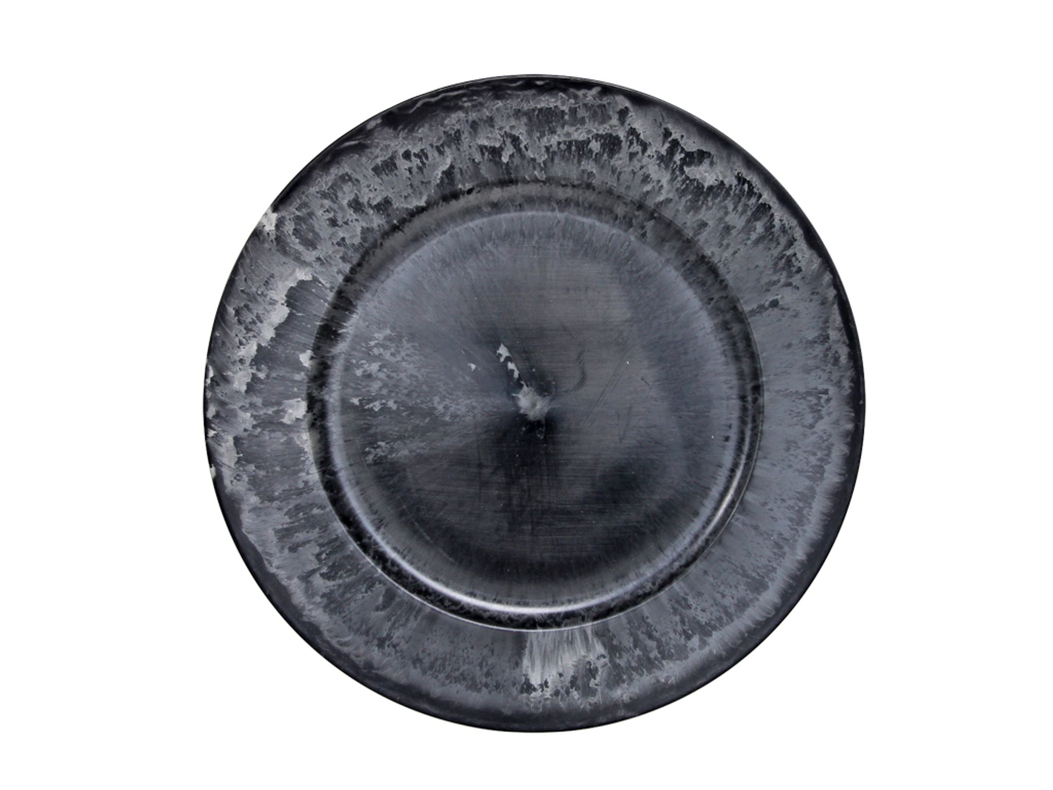 Die Oberfläche zeigt eine interessante Textur mit Farbnuancen zwischen Grau und Schwarz, wodurch jeder Teller leicht variiert und einzigartig wirkt. Mit einem Durchmesser von 33 cm, einer Höhe von 1,8 cm und einer Tellerrandbreite von ca. 5 cm bietet der Teller ausreichend Platz für kreative Arrangements.