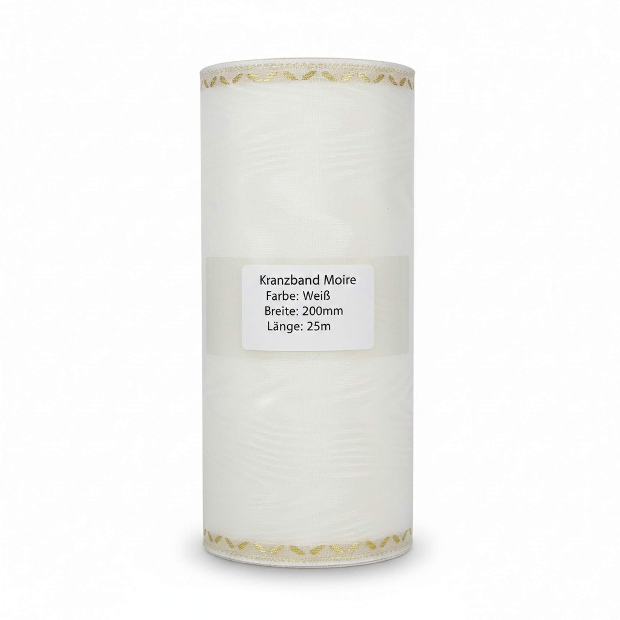 Kranzband Schleifenband Trauerband Moire mit goldener Webkante 200mm 25m weiß